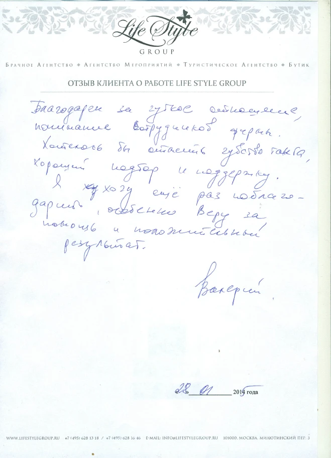 Life Style Group – современная компания свадебной индустрии, отличающаяся от существующих служб знакомств и брачных агентств, собственными эффективными методиками и технологиями, созданными на основе российского и международного опыта в области семейной психологии и коучинга, детальным анализом запросов каждого Клиента и современного рынка услуг, регулярным контролем качества и динамичностью, а также строгой приверженностью к высокими стандартам сервиса, которые позволяют нам быть впереди и превосходить ожидания Клиентов!